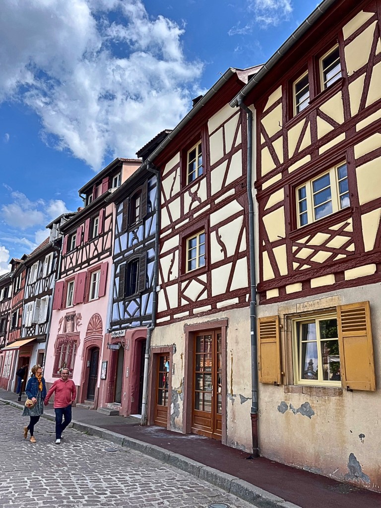 We wandered Rue des Tanneurs as if inside a watercolor painting, where time seemed to pause between one breath and the next. The pastel half-timbered houses, each with its own quiet soul, stood like sentinels from another century, their flower-filled windows watching the canal below. The water mirrored it all—the creamy yellows, soft roses, and gentle blues—doubling the beauty in a way that made us stop again and again, just to look. To feel. To let the light dance in our eyes before moving forward.