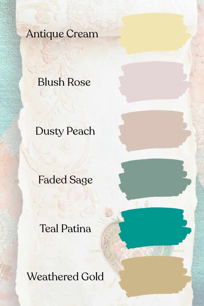 This suite is painted in tender, sun-washed tones: Antique Cream (Pantone 7499 C), Blush Rose (7604 C), Dusty Peach (4755 C), Faded Sage (5565 C), Teal Patina (7716 C), and Weathered Gold (7502 C)—a palette that evokes lace, light, and treasured keepsakes.