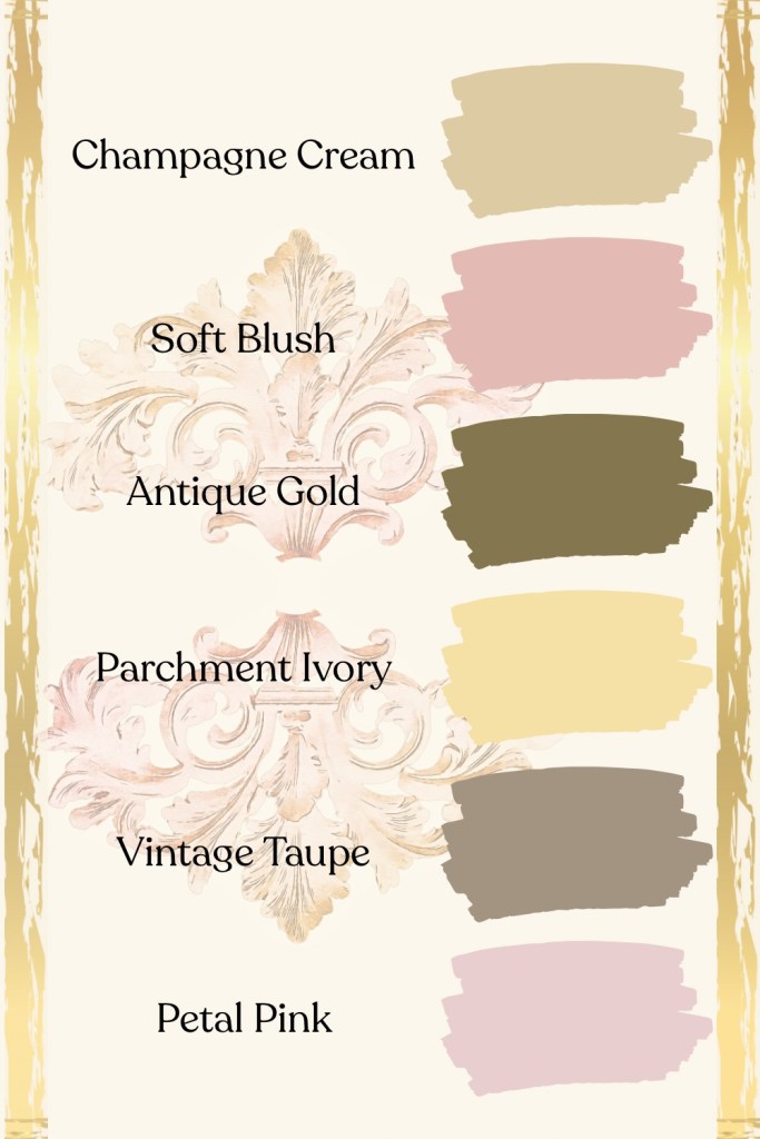Bathed in hues that evoke faded frescoes and rose-petal afternoons, the palette blends Champagne Cream (Pantone 468 C), Soft Blush (Pantone 7605 C), Antique Gold (Pantone 871 C), and Parchment Ivory (Pantone 7401 C), with gentle shadows of Vintage Taupe (Pantone 7530 C) and Petal Pink (Pantone 691 C). Together they create a symphony of romance—delicate, luminous, and timelessly sophisticated.